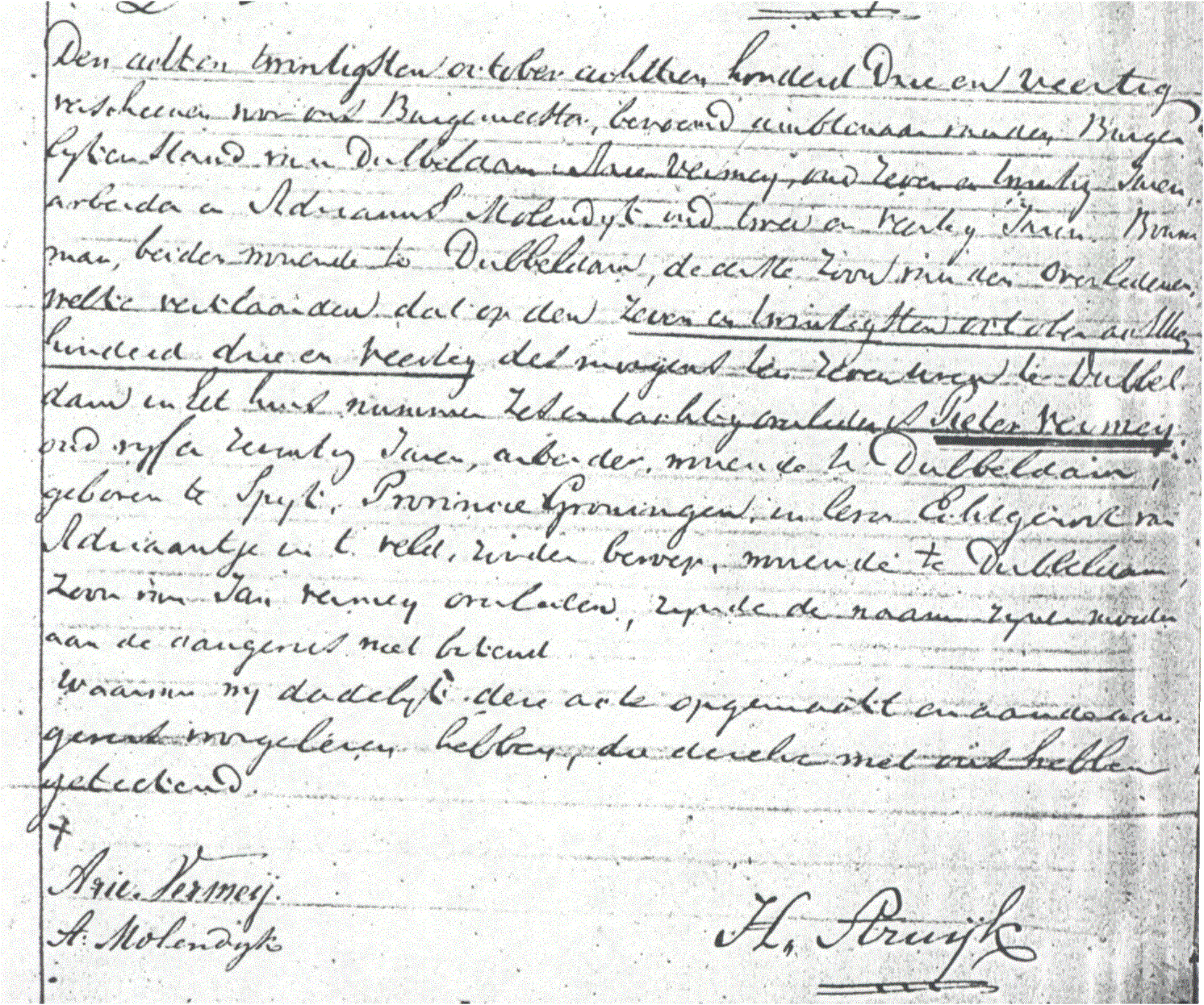 Den achtentwintigsten october, achttienhonderd drie en veertig, verschenen voor ons, Burgemeester, benoemd ambtenaar van den Burgerlijkestand van Dubbeldam, Arie Vermeij, oud zevenentwintig jaren, arbeider, en Adrianus Molendijk, oud twee en veertig jaren, bouwman, beiden wonende te Dubbeldam, de eerste, zoon van de overledene, welke verklaarde dat op den zevenentwintigsten october, achttienhonderd drie en veertig, des morgens ten zeven uren, te Dubbeldam in het huisnummer zes en tachtig, overleden is Pieter Vermeij, oud vijfenzeventig jaren, arbeider, wonende te Dubbeldam, geboren te Spijk, Provincie Groningen, in leven echtgenoot van Adriaantje In 't Veld, zonder beroep, wonende te Dubbeldam, zoon van Jan Vermeij, overleden zijnde, de naam zijnen moeder aan de aangever niet bekend. Waarna wij dadelijk deze akte opgemaakt en aan de aangevers voorgelezen hebben die de akte met ons ondertekend.