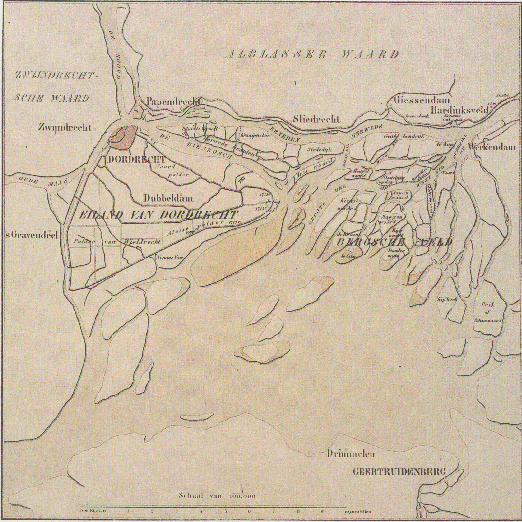Dit is een meer gedetailleerd overzichtkaartje van het eiland van Dordrecht en de omliggende gebieden, omstreeks 1700