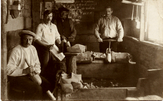 Foto van de klompenmakerij aan de oliepijp te Dordrecht. Op de foto ziet u van links naar rechts: Cornelis Vermeij, de medevennoot uit België, Willem Vermeij en Jacob Vermeij.