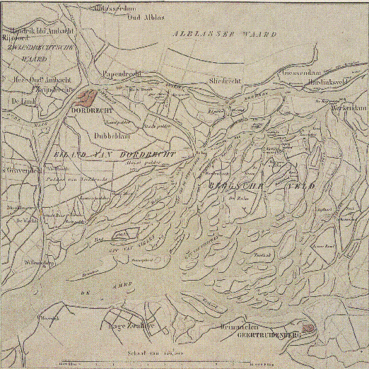 Dit is gedetailleerd overzicht van het eiland van Dordrecht en de omliggende gebieden, omstreeks 1800